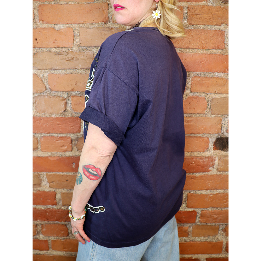 Näyttävä ja persoonallinen, Ranja-merkkinen meriaiheinen T-paita 90-luvulta. Valmistettu Hongkongissa. Valmistettu hengittävästä, hieman joustavasta ja erittäin mukavantuntuisesta puuvillatrikoosta, jonka sävynä tummansininen. Etukappaleella näyttävä meriaiheinen flokkiprintti. Printissä ketjua, ankkureita ja kompasseja, sävyinä valkoinen, beige ja tummansininen. Suora ja lyhythihainen malli pyöreällä pääntiellä. Väri hieman ajan saatossa haalistunut, muutoin erittäin hyväkuntoinen, raikas ja persoonallinen meriaiheinen T-paita!