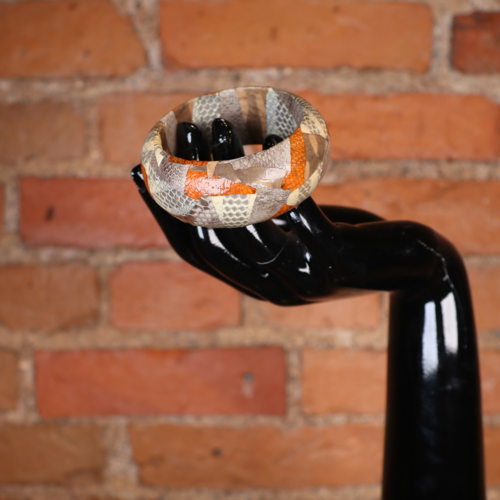 Kaunis ja hurmaava, käsintehty rannerengas käärmeennahkajäljitelmää. Kevyt, pyöreä ja päältä kupera rannerengas, jonka päälle liimattu käärmeennahkaa jäljitteleviä paperimassapaloja. Pääsävyinä harmaa, harmaanruskea ja oranssi. Hyväkuntoinen ja kaunis rannekoru arkeen tai juhlaan!