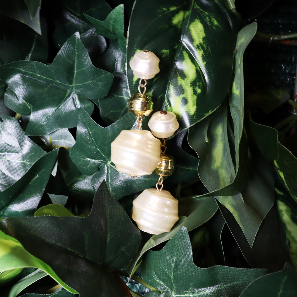 Näyttävät ja isokokoiset, riippuvat helmikorvakorut 90-luvulta. Ostettu valikoimaan vanhan korukaupan varastosta, joten korvakorut ovat täysin käyttämättömät. Valmistettu nikkelivapaasta metallista ja muovista. Tappikiinnitys. Korussa roikkuu näyttävät helmiäis- ja kullanväriset ”pallot”. Uudenveroiset riippuvat helmikorvakorut riippukorvakorut arkeen tai juhlaan!