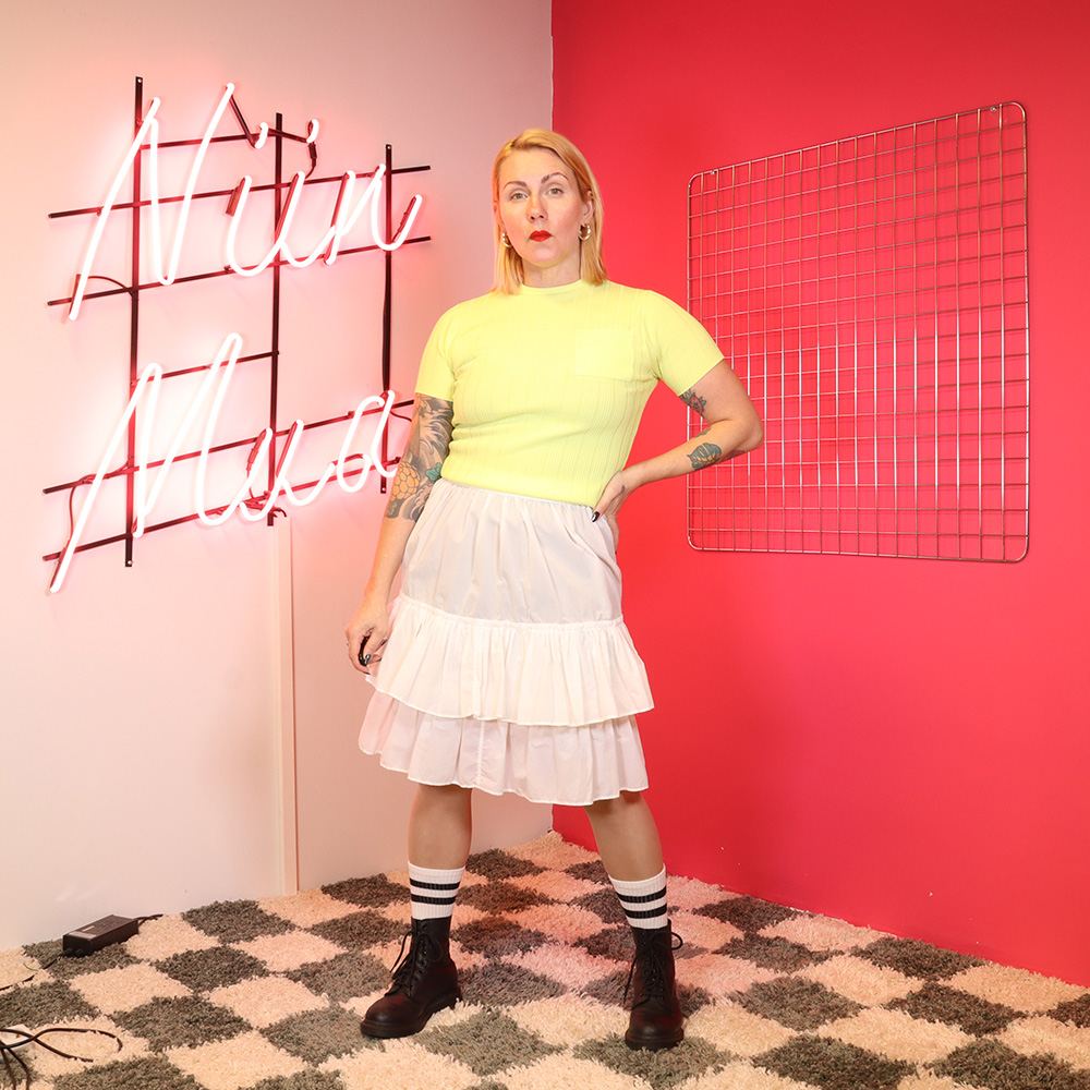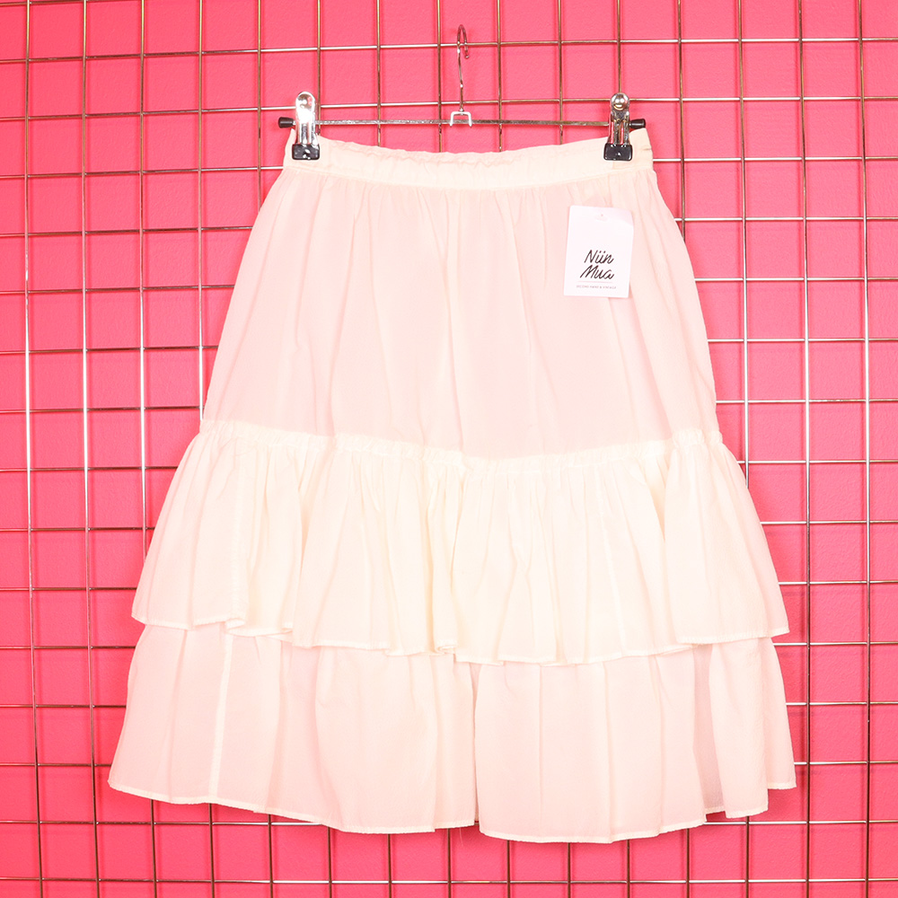 Taidokkaasti itse valmistettu / teetetty vanha röyhelöhelmainen vintage-alushame. Valmistettu hieman läpikuultavasta, tärkätystä materiaalista. Hameen helma kauniisti kerrostettu. Nappikiinnitys, jolloin VY todella kapea, mutta hameeseen on jälkikäteen lisätty napinlävellinen kuminauha, jolloin mahtuu isommalle koollekin (alushameena, piilossa). Ikäisekseen hyväkuntoinen ja kaunis vintage-alushame