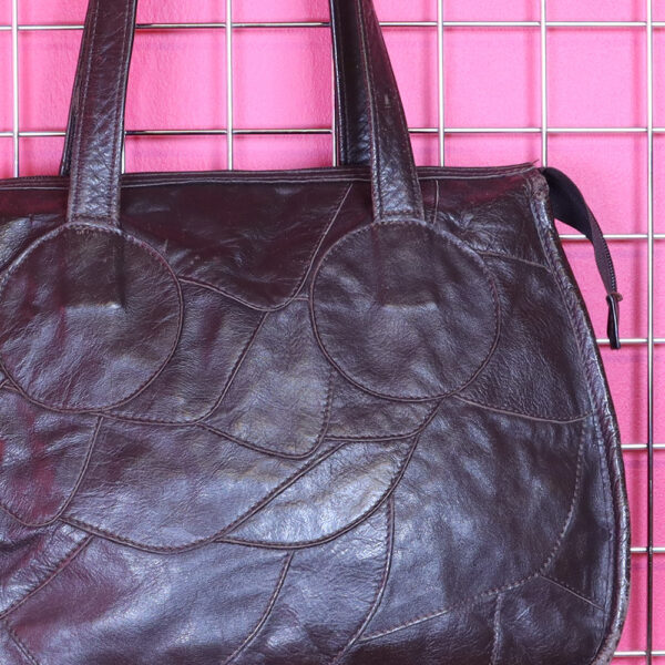 Ihana, ruskea palanahkalaukku 60/70-luvulta. Valmistettu ruskeansävyisistä nahkapaloista. Ajaton, hieman satulalaukkumallinen laukku. Vuoritettu kankaalla, laukun sisällä vetoketjukiinnitteinen sivutasku. Vetoketjukiinnitys, kaksi pitkää kantohihnaa. Vuoressa kulumaa ja nahan pinnassa luonnollista patinaa, mutta yleisilmeeltään siisti palanahkalaukku, joka kestää aikaa ja trendejä!