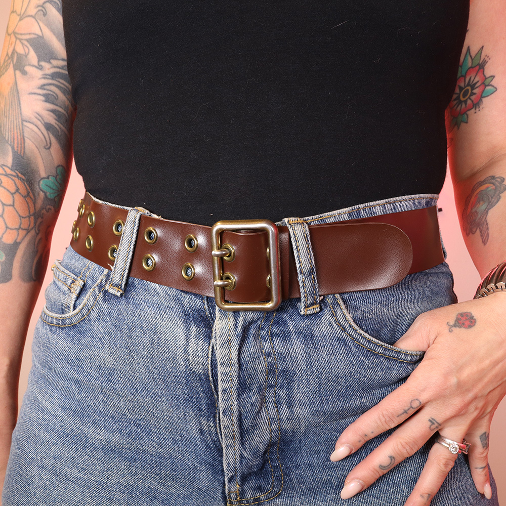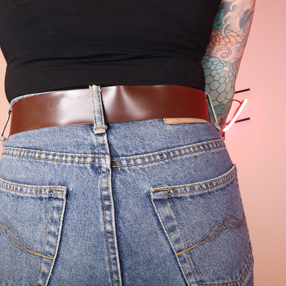 Hurmaava ruskea vintage-vyö 60/70-luvulta. Valmistettu puolikiiltävästä ruskeanvärisestä vinyylistä. Sisäpinta harmaa. Messinkinen solki ja tuplarei’itys. Pinnassa pientä kulumaa, muutoin hyväkuntoinen ja hurmaava ruskea vintage-vyö!
