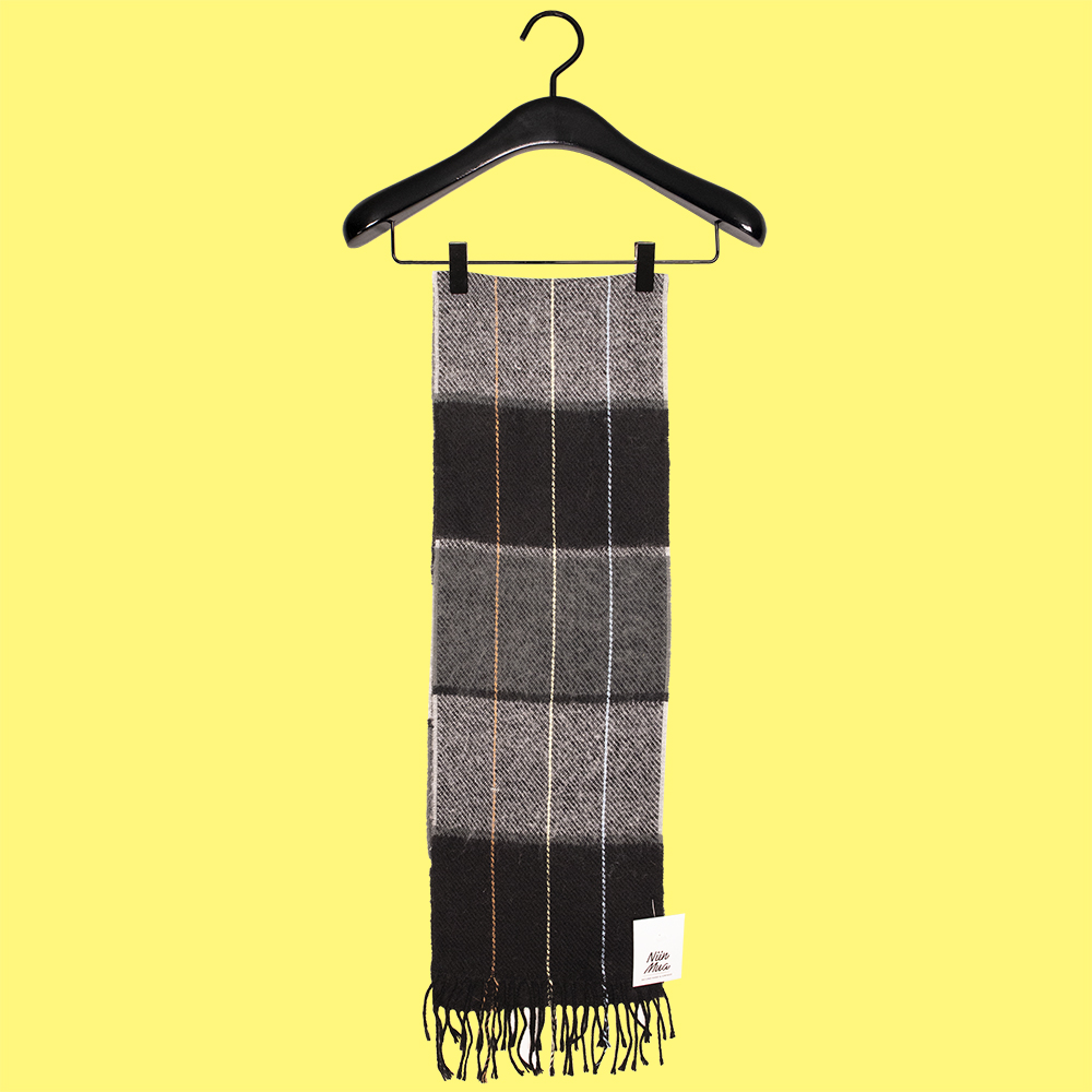Lämmin ja ajaton, ruudullinen kaulaliina. Ei valmistaja-/valmistusmaatietoa. Pehmeää ja lämmintä akryyliä, jossa ajaton ruutu- ja viivakuosi. Akryyliä tunnun ja ulkonäön perusteella, ei materiaalitietoa. Ruutukuosin sävyinä musta, harmaa ja valkoinen. Viivojen sävyinä persikka, vaaleankeltainen ja vaaleansininen. Ajaton kaitamalli hapsuilla. Pinta hieman huopaantunut, muutoin hyväkuntoinen, ajaton ja lämmin kaulaliina talvikauteen!