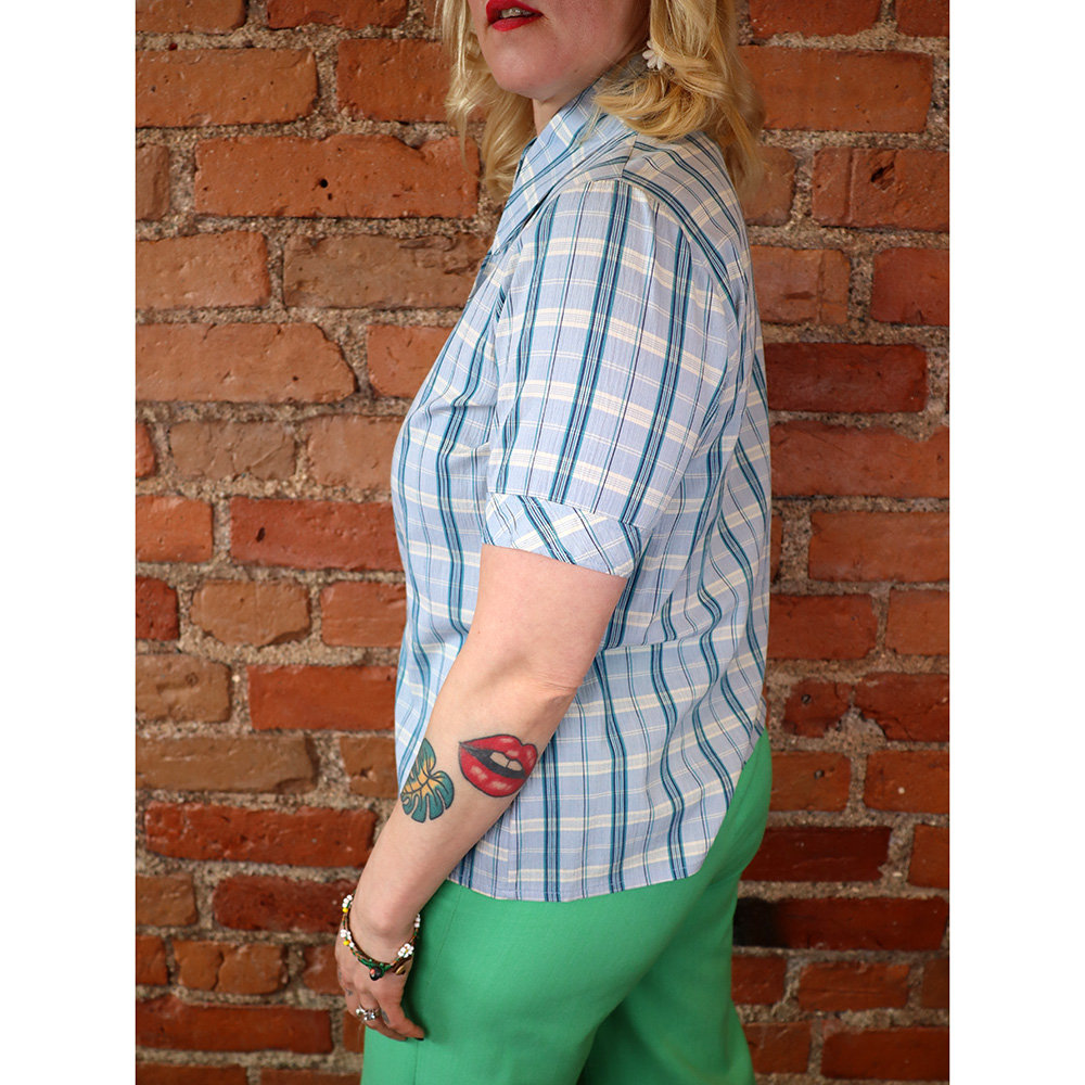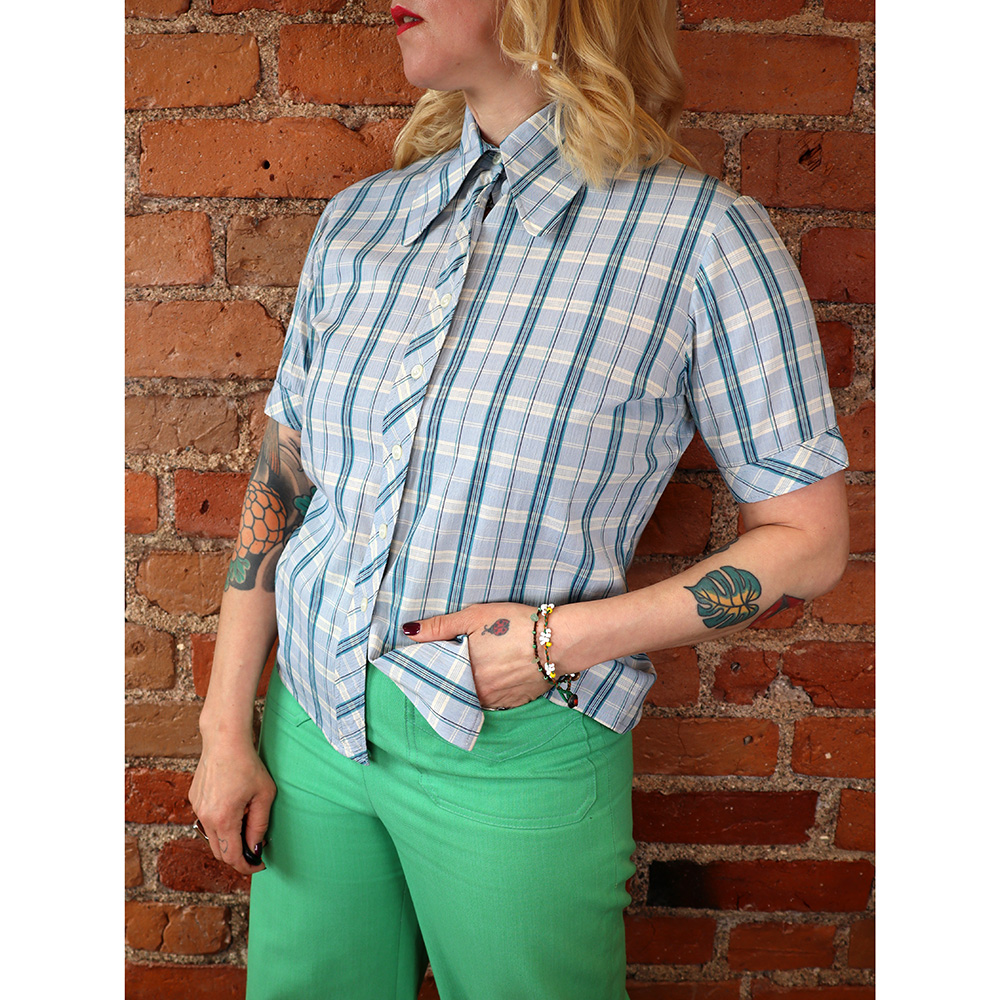 Kaunis ja ajaton, Slim-Style -merkkinen lyhythihainen kauluspaita 60-luvulta. Ei valmistusmaatietoa. Muotokielen, niskalapun ja materiaalin perusteella valmistettu 1960-luvulla. Valmistettu sileästä, kevyestä ja hengittävästä puuvillasta, jossa ajaton ruutukuosi. Kuosin sävyinä vaaleansininen, keskisininen ja valkoinen. Hurmaava, muotoonommeltu ja lyhythihainen kauluspaitamalli, jossa aikakautensa hurmaava kauluskäänne. Kiinnitys etupituudelta muovinapein. Käännetty hihansuu. Suora helma. Hyväkuntoinen, ihastuttava ja ajaton kauluspaita 60-luvulta!