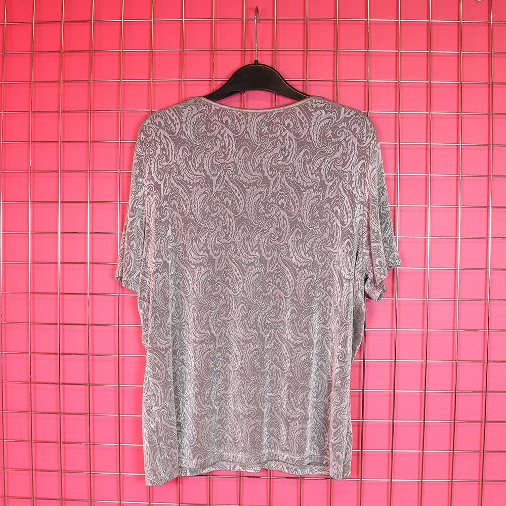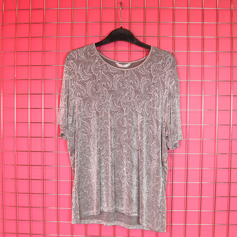 Marks & Spencer St.Michael -tuotemerkille 90-luvulla valmistama hurmaava hopea paita. Valmistettu UK:ssa. Valmistettu kauniisti laskeutuvasta ja kiiltävästä trikookankaasta, jossa tummanhopealla pohjalla vaaleampi ornamenttistruktuuri. Lyhythihainen malli, jossa istutettu hiha. Erittäin hyväkuntoinen hopea paita ympärivuotiseen arki- tai juhlakäyttöön!