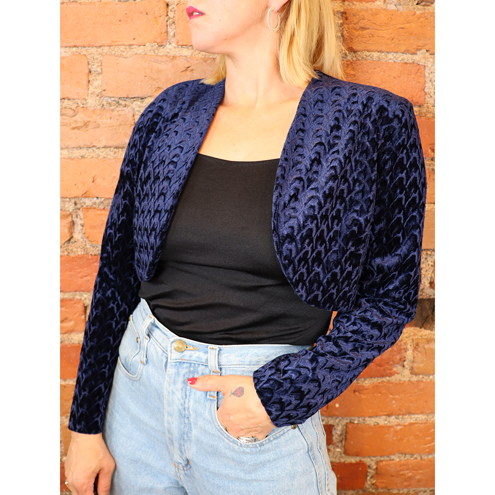 Tazzia Oy:n Suomessa 1990-luvulla valmistama kaunis sininen bolero. Valmistettu kauniisti hohtavasta ja strukturoidusta sametista. Lyhyt boleromalli, jossa pyöristetyt liepeet. Ei kiinnitysmekanismia. Pitkät hihat. Pienet olkatoppaukset. Hyväkuntoinen ja monikäyttöinen sininen bolero ympärivuotiseen käyttöön!