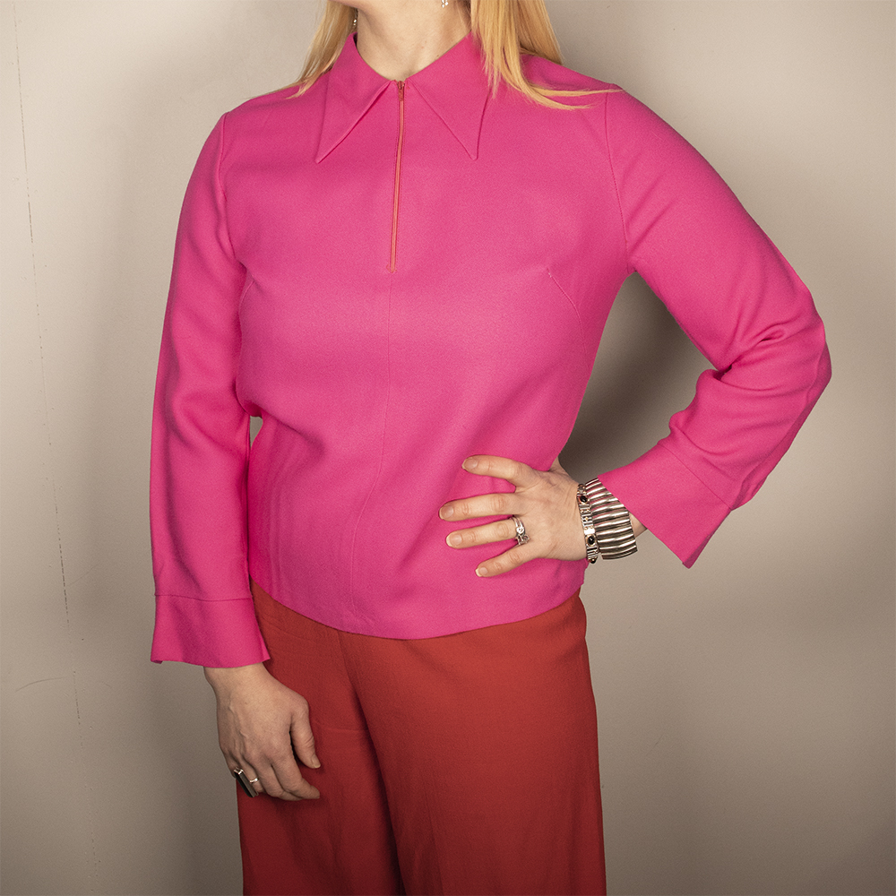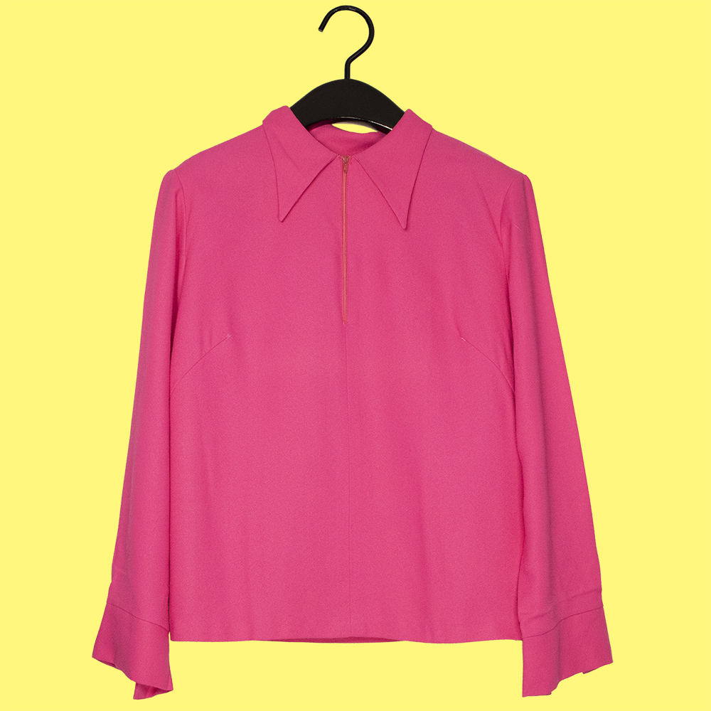 Todella hurmaava, TJ Helsinki -tuotemerkin pinkki kauluspusero 60-luvulta. Paita on ostettu vanhan vaatekaupan jäämistöstä, joten se on täysin käyttämätön. Muotokielen, materiaalin ja niskalapun perusteella valmistettu 1960-luvulla. Valmistettu joustamattomasta ja kevyesti teksturoidusta polyesterista, jonka sävynä hurmaava pinkki. Villaa/villasekoitetta tunnun ja ulkonäön perusteella, ei materiaalitietoja. Pitkähihainen puseromalli, jossa aikakautensa kärjistyvä kauluskäänne. Kiinnitys pääntieltä lyhyellä vetoketjulla. Napitus ranteella. Muotolaskokset rinnalla ja takaolalla. Suora helma. Käyttämätön, kaunis ja ihastuttava kotimainen paita 60-luvulta!