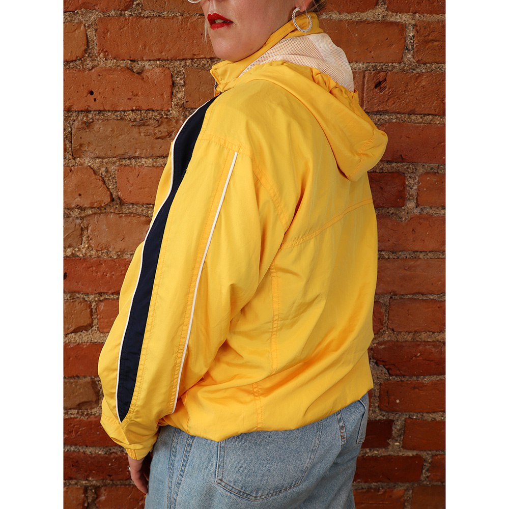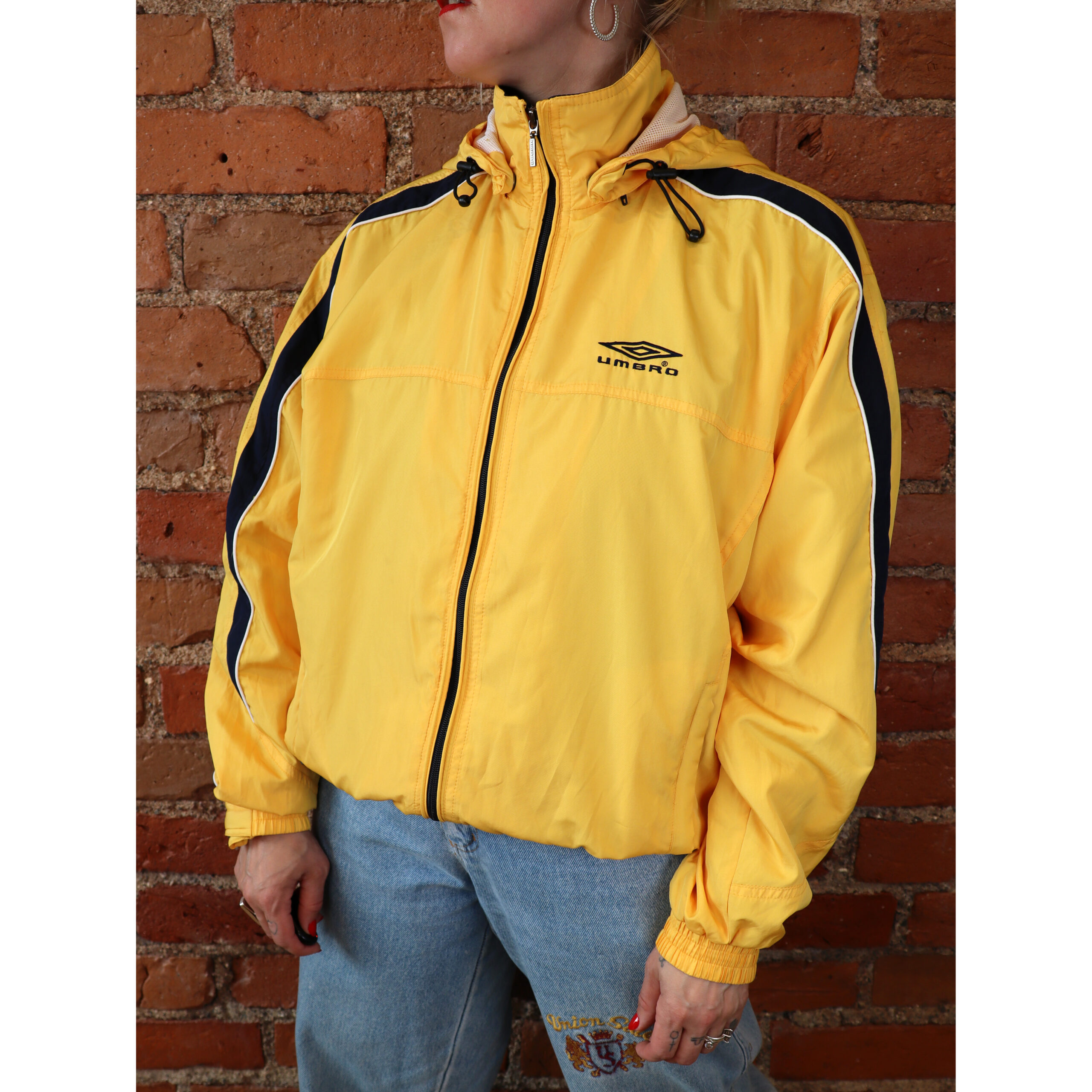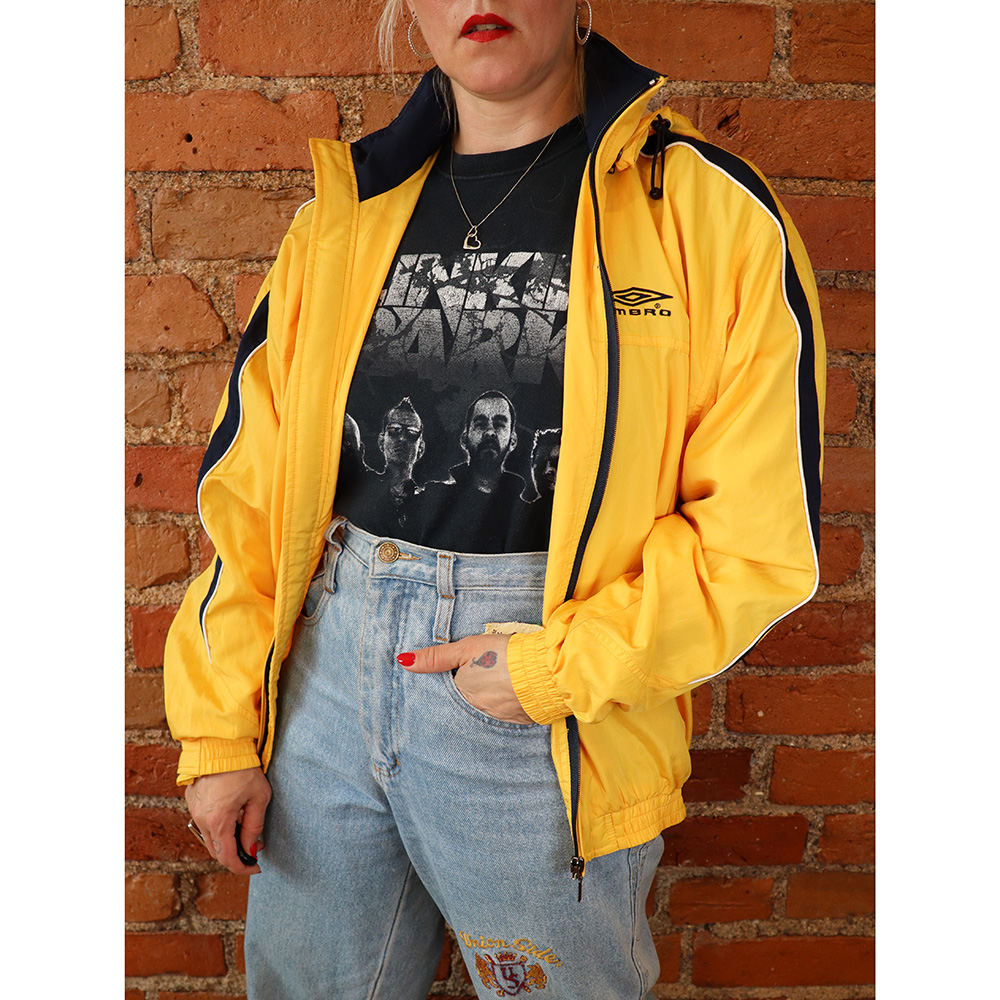 Umbro-merkkinen 90-luvulla valmistettu vintage-urheilutakki. Valmistettu Kiinassa. Tuotetietolappujen ja muotokielen perusteella valmistettu 90-luvun lopulla. Valmistettu keltaisesta urheilukankaasta, ysityiskohdat siniset ja valkoiset. Klassinen urheilutakkimalli, jossa irrotettava huppu ja vetoketjulliset sivutaskut. Verkkovuori. Erittäin hyväkuntoinen vintage-Umbro unisex-käyttöön!