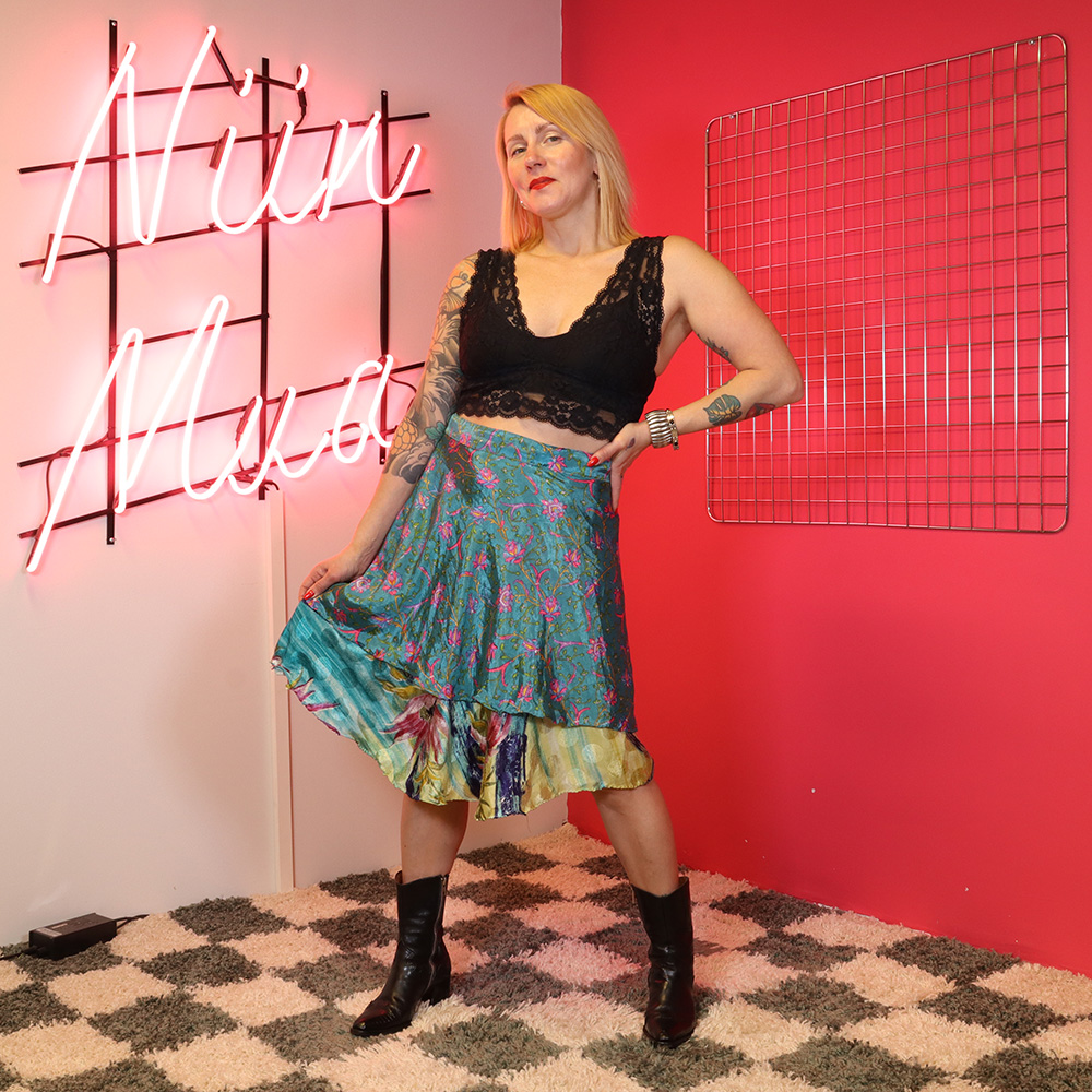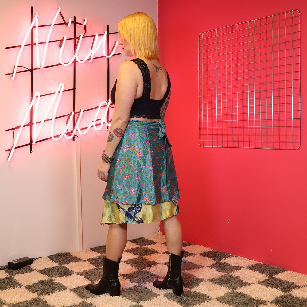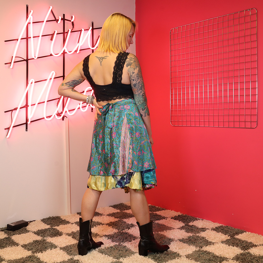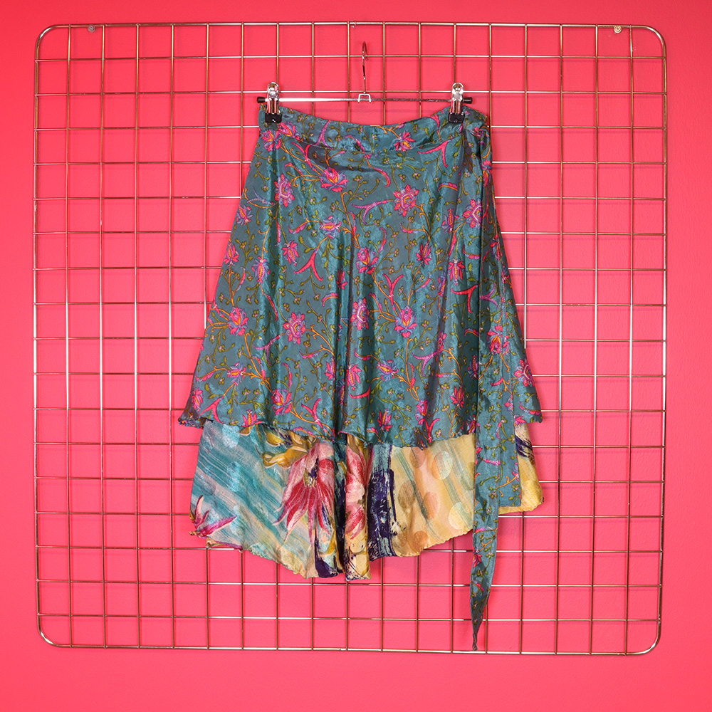 Jonkun taidokkaasti itse valmistama kerrostettu kietaisuhame, todennäköisesti 90-luvulta. Kietaisumalli, jota voi käyttää molemmin päin – joko lyhyempi kerros päällä tai alla! Lyhyempi kerros silkkiä, pidempi kerros puuvilla. Kiinnitys pitkillä nauhoilla Erittäin hyväkuntoinen ja täysin uniikki kietaisuhame kesäpävään tai -juhlaan!