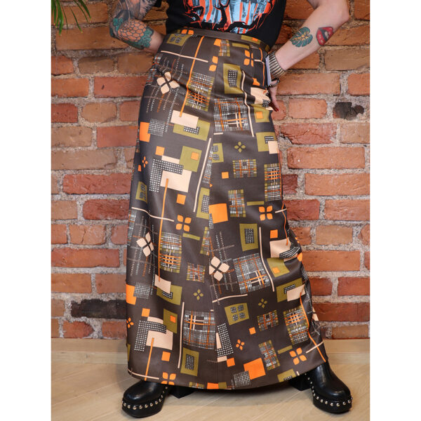 Todella kaunis ja näyttävä bohohenkinen maksihame 60-luvulta. Koska hame on itse valmistettu / teetetty, on se täysin uniikki. Valmistettu helppohoitoisesta polyesteritrikoosta, jossa ruskealla pohjalla aikakautensa funk-henkinen kuosi. Kuosin sävyinä oranssi ja vihreän sekä ruskean eri sävyt. Helmaa kohden vahvasti levenevä, runsas A-linjainen malli. Kapea vyötärökaitale. Kiinnitys keskitakasaumasta vetoketjulla, vyötärökaitaleella nappi. Kokonaan vuoritettu.