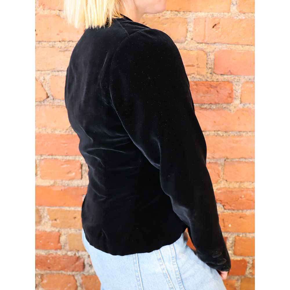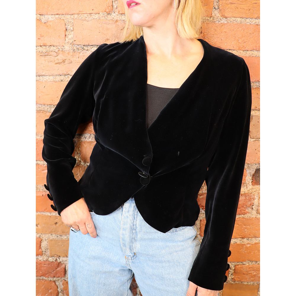 Kaunis ja näyttävä itse valmistettu / teetetty samettijakku todennäköisesti 90-luvulta. Koska jakku on itse valmistettu / teetetty, on se täysin uniikki. Valmistettu kauniisti hohtavasta sametista. Lyhyt, tyköistuva malli. Syväänuurrettu pääntie. Kiinnitys piilohakasella, päällä koristeelliset, päällystetyt napit. Täyspitkä hiha, jossa hihansuussa koristeelliset napit. Kokonaan vuoritettu värikkäällä kankaalla. Yksi piilohakanen puuttuu ja niskassa huomaamattomasti korjattu repeämä, muutoin hyväkuntoinen ja näyttävä samettijakku, joka sopii myös kesällä takkikäyttöön!