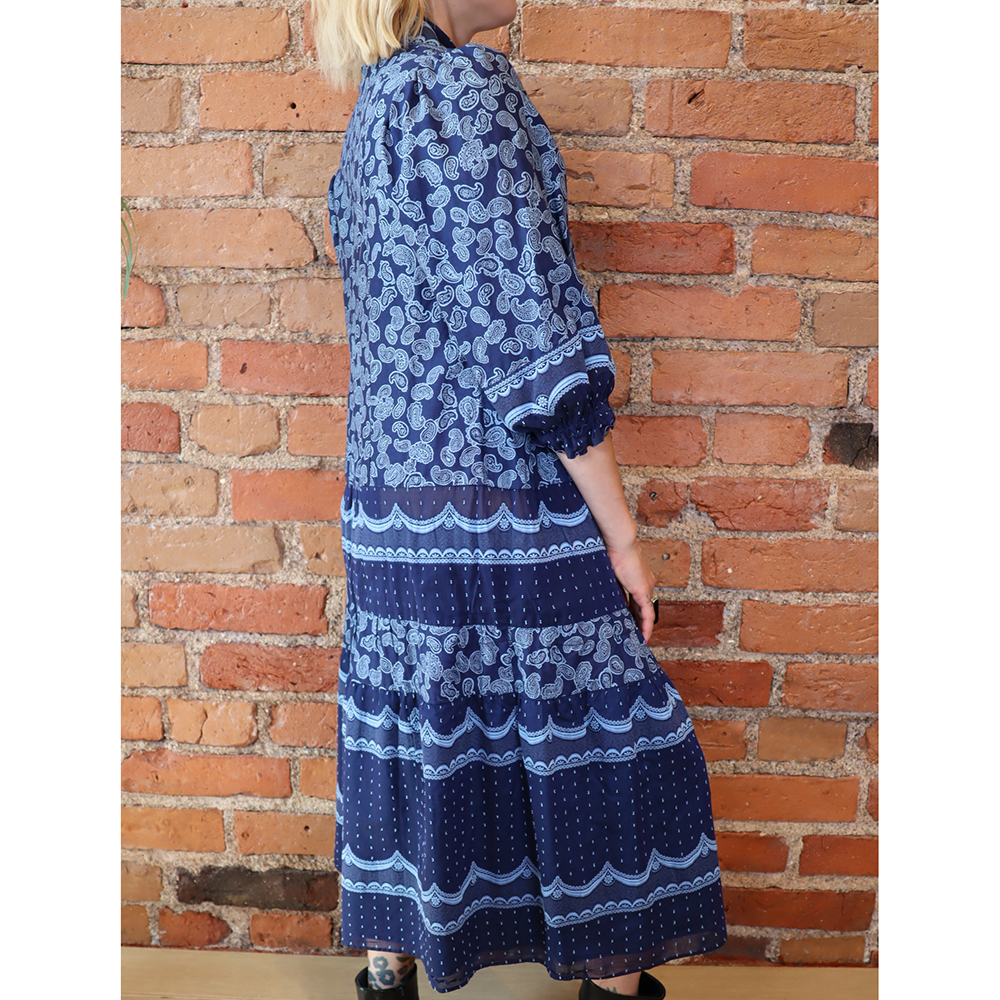 Todella kaunis ja tyylikäs, sininen leninki 70-luvulta. Todennäköisesti itse tehty / teetetty, joten leninki on täysin uniikki. Valmistettu puuvillasta / puuvillasekoitteesta, jonka pohjasävynä tumma sininen, pinnan kuosi vaaleansininen. Kuosissa paisley-kuosia, ornamenttikuosia ja pilkkukuosi. Eri kuosit upeasti aseteltu leningin eri osiin / kerroksiin. Leveä kauluskäänne, muotosauma lantiokorkeudella, kerrostettu helma. Täyspitkä hiha, jossa hihansuulla kuminauhoitus. Hameosa kokonaan vuoritettu. Kiinnitys keskietusaumasta piiloneppareilla. Hyväkuntoinen, kaunis ja monikäyttöinen sininen leninki ympärivuotiseen käyttöön!