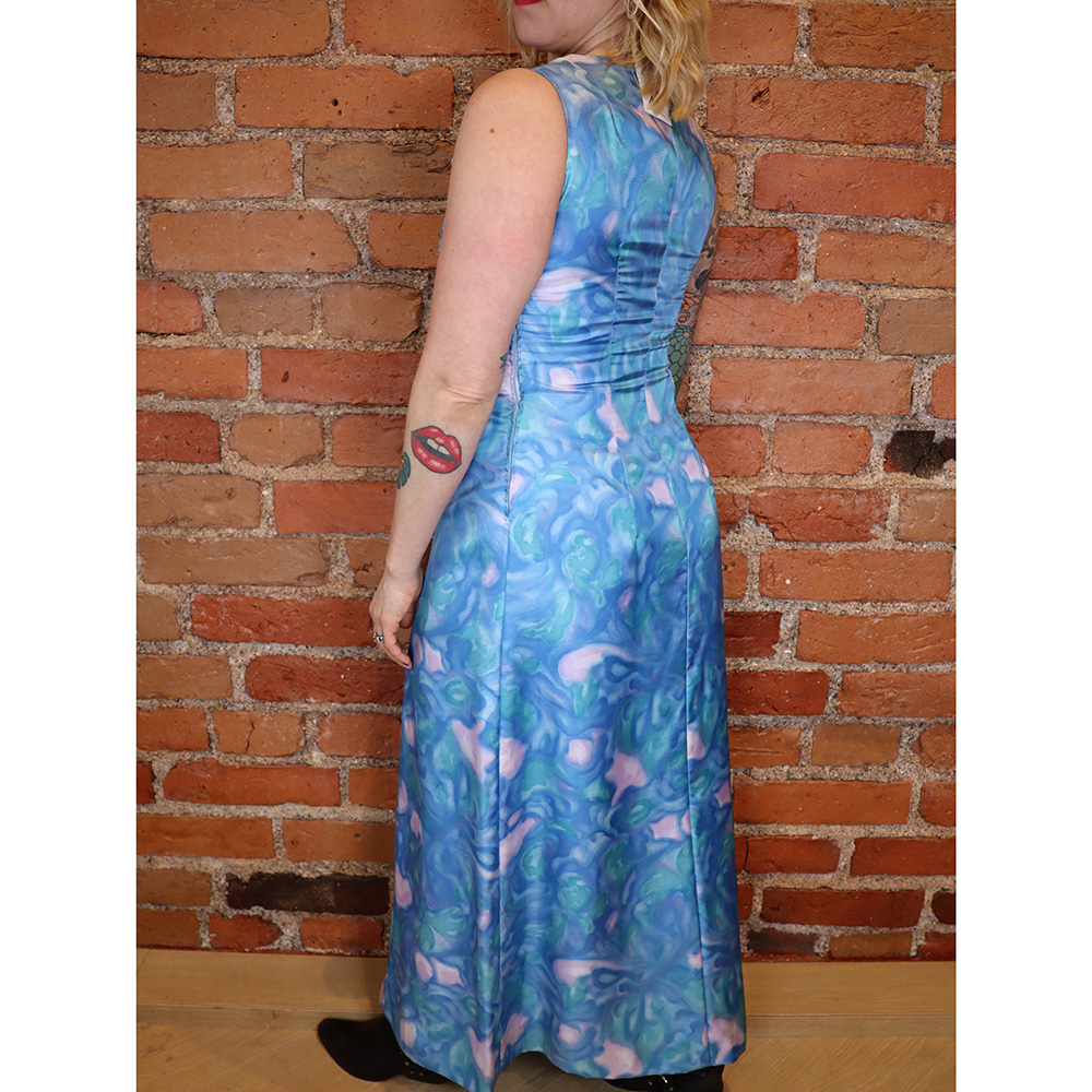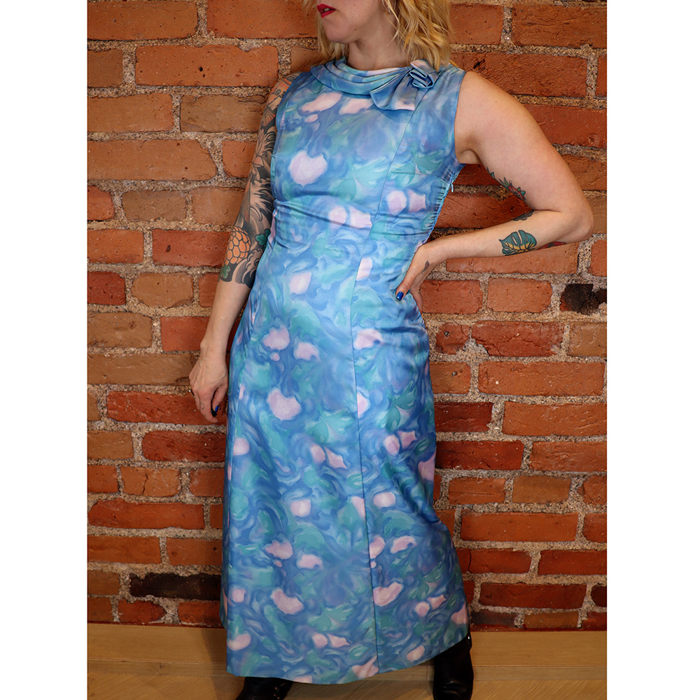 Todella kaunis ja hurmaava ompelijalla teetetty / kotikoneella taidokkaasti valmistettu juhlamekko 60-luvulta. Koska mekko on käsin valmistettu. Muotokielen, kuosin ja materiaalin perusteella valmistettu 1960-luvulla. Valmistettu vahvasta, sileästä ja kauniisti hohtavasta asetaatista, jossa abstrakti vesivärikuosi. Kuosin sävyinä rauhallinen sininen, minttu ja laventeli. Kokonaan vuoritettu. Kaunis, täyspitkä ja hihaton mekkomalli, jossa upeasti laskostettu pääntie. Rusetti etusivussa. Kevyesti helmaan levenevä, sisäänotettu malli. Muotoleikkaukset etu- ja takakappaleella. Kiinnitys sivusaumasta muovivetoketjulla. Erittäin hyväkuntoinen, hurmaava ja kaunis, uniikki juhlamekko 60-luvulta!
