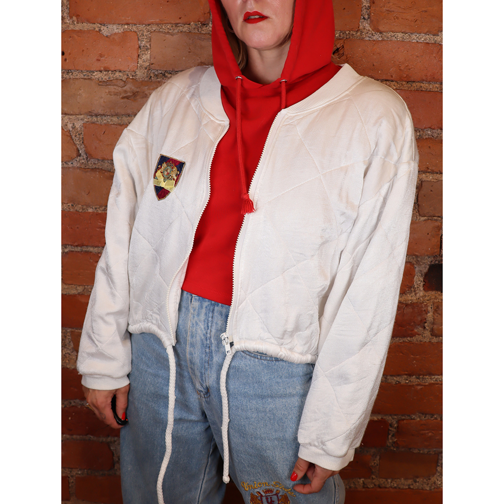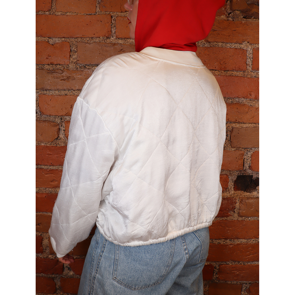 Taidokkaasti itse / teetetty valkoinen bomber-takki 80/90-luvulta. Koska takki on itse valmistettu / teetetty, on se täysin uniikki. Ihana, rento ja lyhyt, laatikkomainen bomber-takkimalli. Tilava hiha. Valmistettu valkoisesta satiinikankaasta, joka on kevyesti vanutettu ja tikattu. Pääntiellä ja hihansuissa joustinneulosta. Helmassa kiristysnyöri. Kiinnitys vetoketjulla. Pinnassa jonkin verran nukkaa, mutta yleisilmeeltään siisti ja helppokäyttöinen valkoinen bomber-takki, joka soveltuu myös jakkukäyttöön!