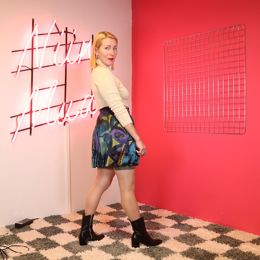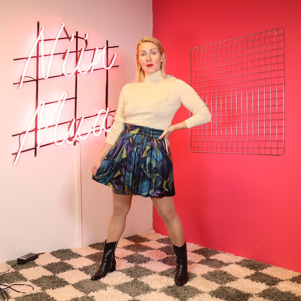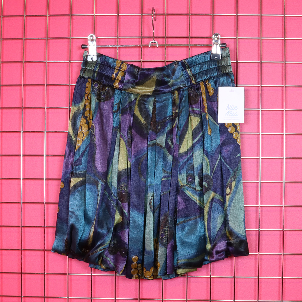 Taidokkaasti itse valmistettu / teetetty värikäs hame 90-luvulta. Valmistettu kauniisti lakeutuvasta ja kiiltäväpintaisesta viskoosista, jossa värikäs kuosi. Lyhyt, pussiin ommeltu laskoshamemalli. Vyötärökaitale sivuilta kuminauhoitettu. Toisella sivusaumalla tasku. Hyväkuntoinen ja hauska, värikäs hame kesäpäiviin!