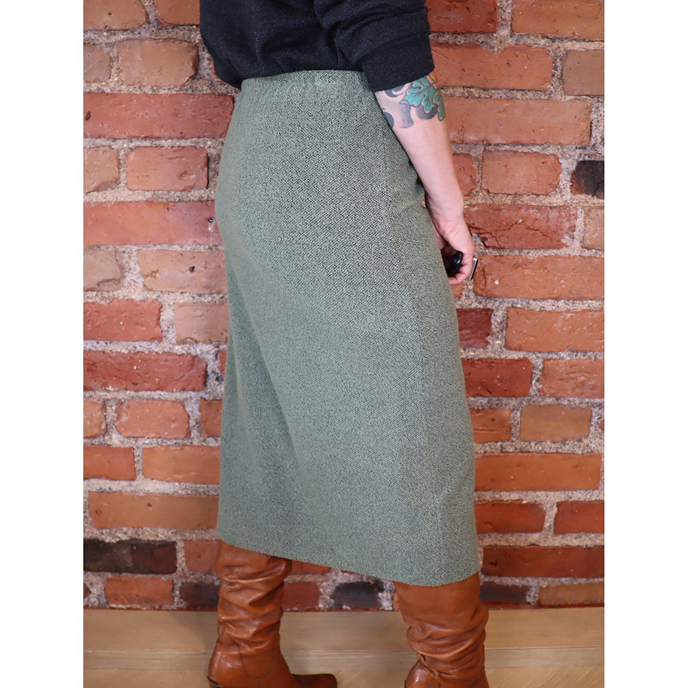 Kaunis ja ajaton, itse valmistettu / teetetty vintage-hame todennäköisesti 1990-luvulta. Koska hame on itse valmistettu / teetetty, on se täysin uniikki. Valmistettu joustavasta materiaalista, jossa mustalla pohjalla vaalea oliivinvihreä buklee-pinta. Puolipitkä, suora malli, jossa vyötäröllä kuminauha. Ei vuorta. Erittäin hyväkuntoinen, ajaton ja monikäyttöinen vintage-hame ympärivuotiseen käyttöön!