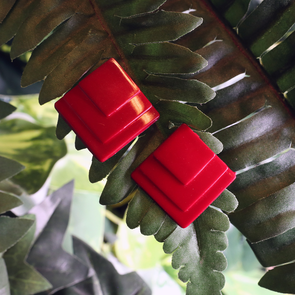 Näyttävät ja raikkaat, viininpunaiset korvakorut 90-luvulta. Ostettu valikoimaan vanhan korukaupan varastosta, joten korvakorut ovat täysin käyttämättömät. Valmistettu viininpunaisesta muovista. Kärjellään seisova neliömuoto, jossa kolme tasoa. Tappikiinnitys. Myös tappi ja lukko muovia. Uudenveroiset viininpunaiset korvakorut arkeen tai juhlaan!