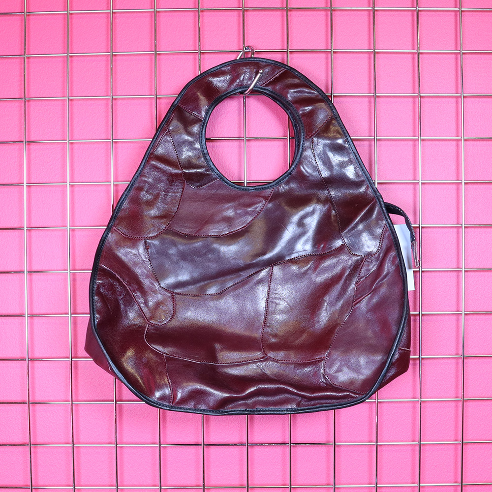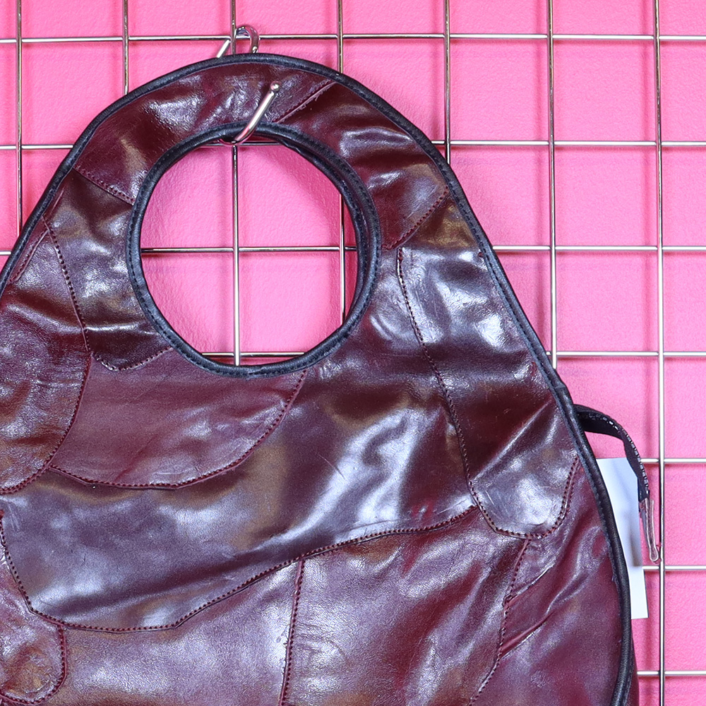 Ihana, vintage-palanahkalaukku 60/70-luvulta. Todennäköisesti itse taidokkaasti valmistettu. Valmistettu punaruskeansävyisistä nahkapaloista. Aikakautensa boho chic -tyylinen laukku, jossa pyöreät otinreiät. Laukun takakappaleella vetoketjullinen sivutasku. Kokonaan vuoritettu värikkäällä kankaalla, vuorella vetoketjullinen sivutasku. Vetoketjukiinnitys. Todella hyväkuntoinen ja näyttävä vintage-palanahkalaukku myös nykypäivän trendeihin!