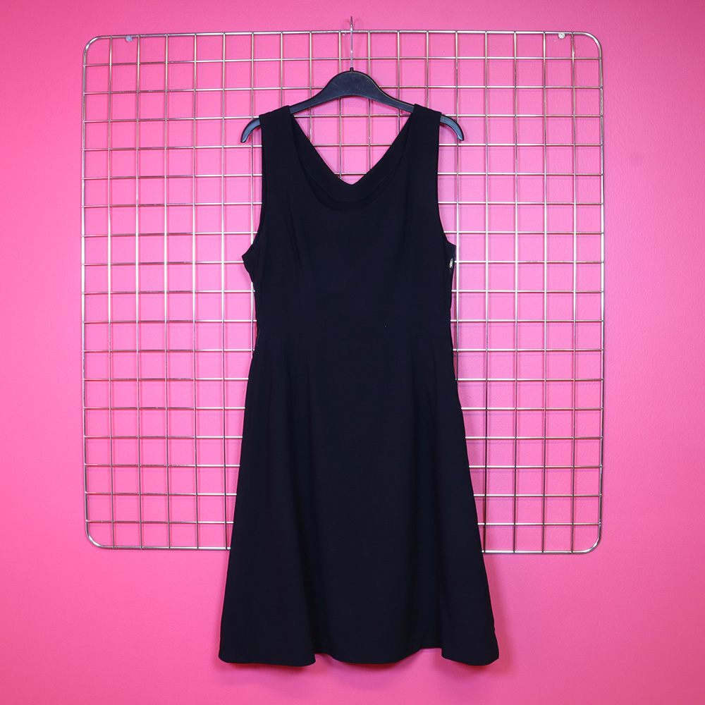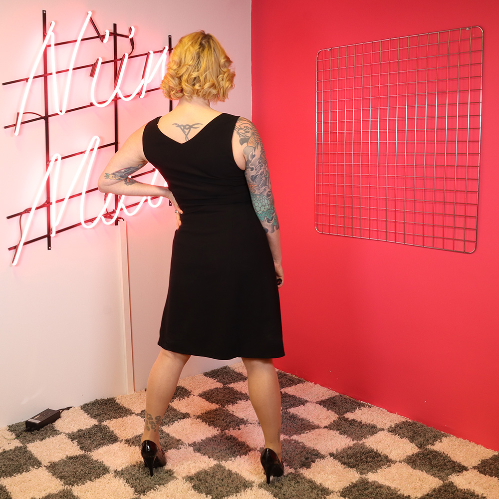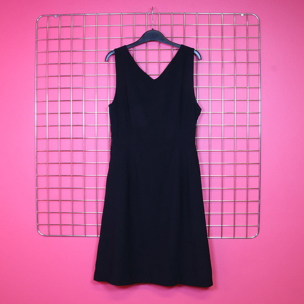 Kaunis, ajaton ja elegantti pikkumusta 50-luvulta. Ei valmistajatietoja. Valmistettu hienosta villakankaasta, jonka värinä musta. Upea kaksiosainen malli, jossa vyötäröllä muotosauma. Yläosa hihaton. Etukappaleen pääntie pyöreä, takakappaleella V-leikkaus. Hameosa lyhyt ja A-linjainen. Hameosa vuoritettu. Kiinnitys sivusaumasta metallivetoketjulla. Vyötärön sivusaumoilla kevyet vyölenkit. Erittäin hyväkuntoinen kaunis ja elegantti pikkumusta tilaisuuteen kuin tilaisuuteen!