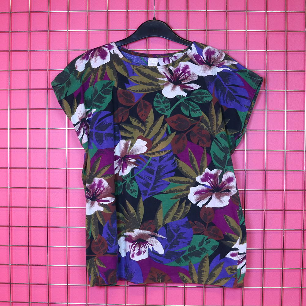 Kaunis ja näyttävä vintage-trikootoppi 90-luvulta. Valmistettu Portugalissa. Valmistettu puuvillatrikoosta, jossa mustalla pohjalla trooppinen kasvikuosi. Suora malli, holkkihiha. Paidan helmassa etu- ja takakappaleella taidokkaasti ja huomaamattomasti paikatut reiät, muutoin hyväkuntoinen vintage-trikoopaita!