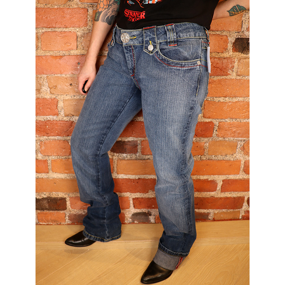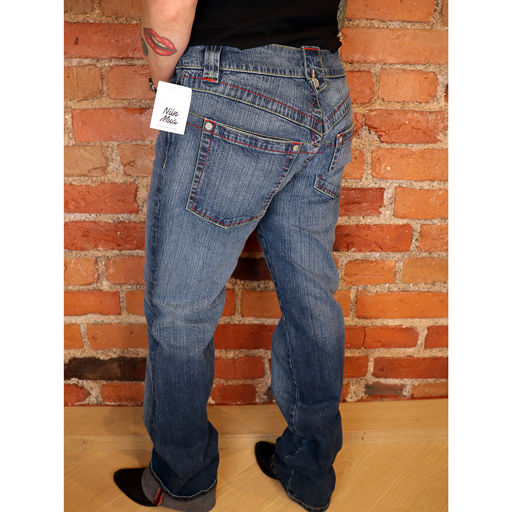 Vero Modan WM Jeans -tuotemerkille 00-luvun alussa valmistamat low rise -farkut. Valmistettu Turkissa. Valmistettu hieman joustavasta, pestystä denim-kankaasta. Upeat, aikakautensa matalavyötäröiset farkut, joissa näyttävät punaiset ja keltaiset koristetikkaukset. Suora lahje. Etu- ja takataskut. Näyttävät vyölenkit. Hyväkuntoiset ja näyttävät aikakautensa, aidot low rise -farkut.