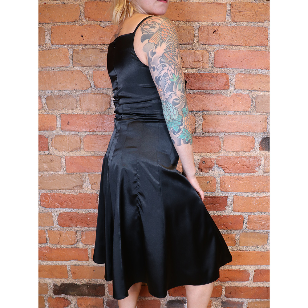 Your Face -merkkinen kaunis ja ajaton musta satiinimekko 90-luvulta. Ei valmistusmaatietoja. Valmistettu kauniisti hohtavasta ja laskeutuvasta mustasta satiinikankaasta. Kokonaan vuoritettu. Upea kaksiosainen, hihaton malli, jossa leikkaus rinnan alla empirelinjassa. Kaunis, laskostettu vesiputouspääntie. Helmaosa runsas ja A-linjainen. Kiinnitys niskasta piilovetoketjulla. Yksi huomaamaton langanveto, muutoin erittäin hyväkuntoinen ja monikäyttöinen musta satiinimekko.
